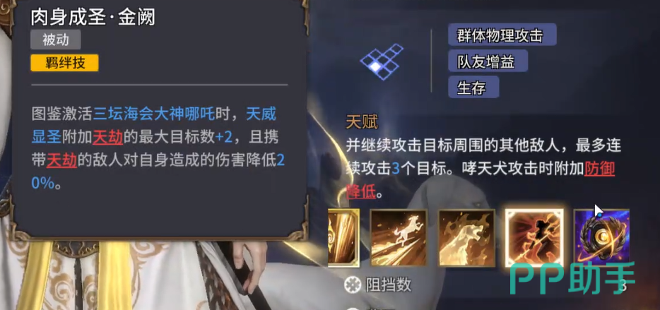 在被动技能方面,杨戬同样不容小觑。他的“肉身成圣”可以在激活哪吒图鉴时,增加终结技“天劫”的最大目标数。携带“天劫”的敌人对杨戬造成的伤害还会减少20%,进一步增强了他在战场上的生存能力。而另一个被动技能“护法神犬”,则能让哮天犬的每次攻击都为杨戬提供额外的伤害加成,最多能叠加3层,这样一来,杨戬的输出和持续作战能力都得到了很大提升。