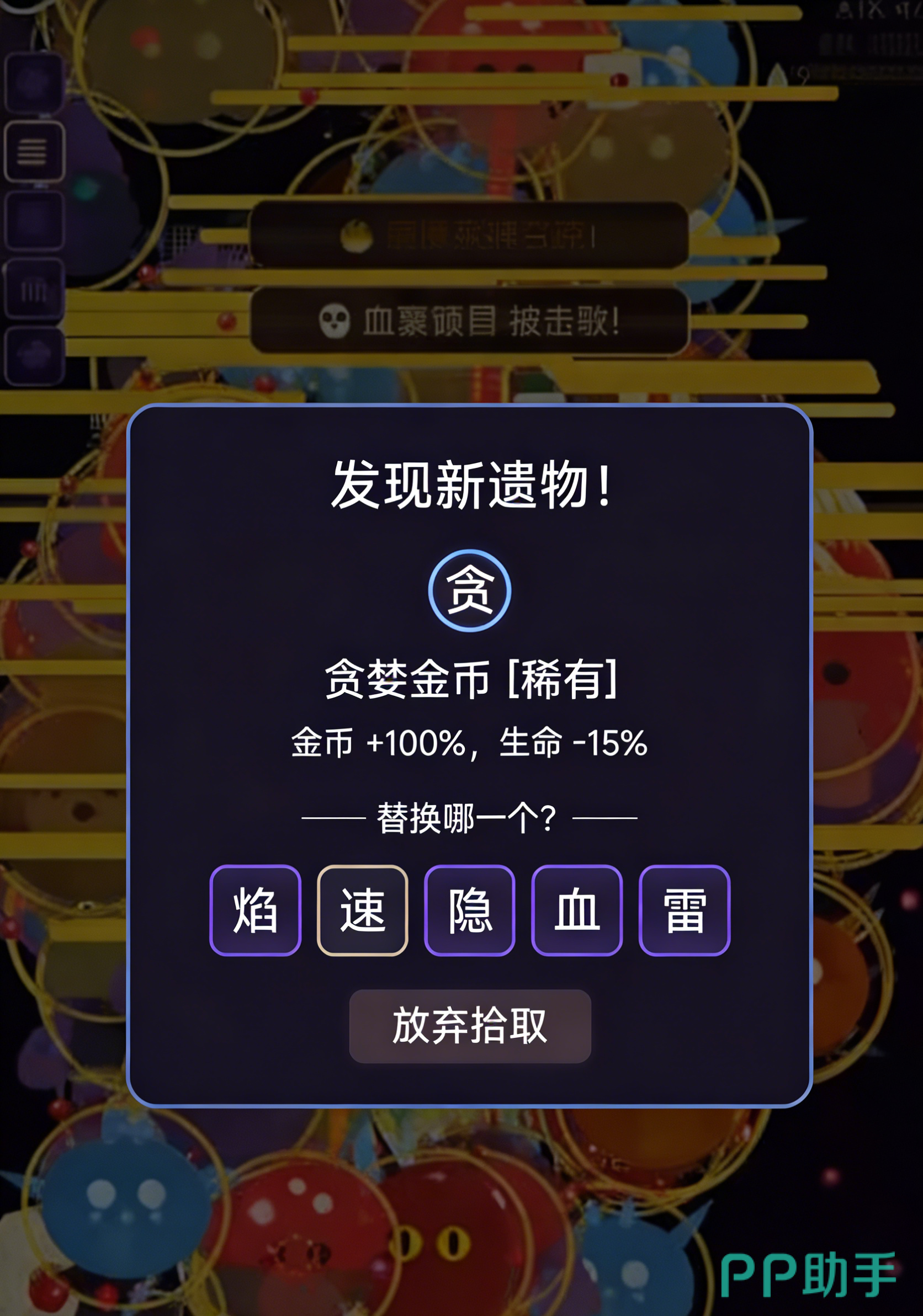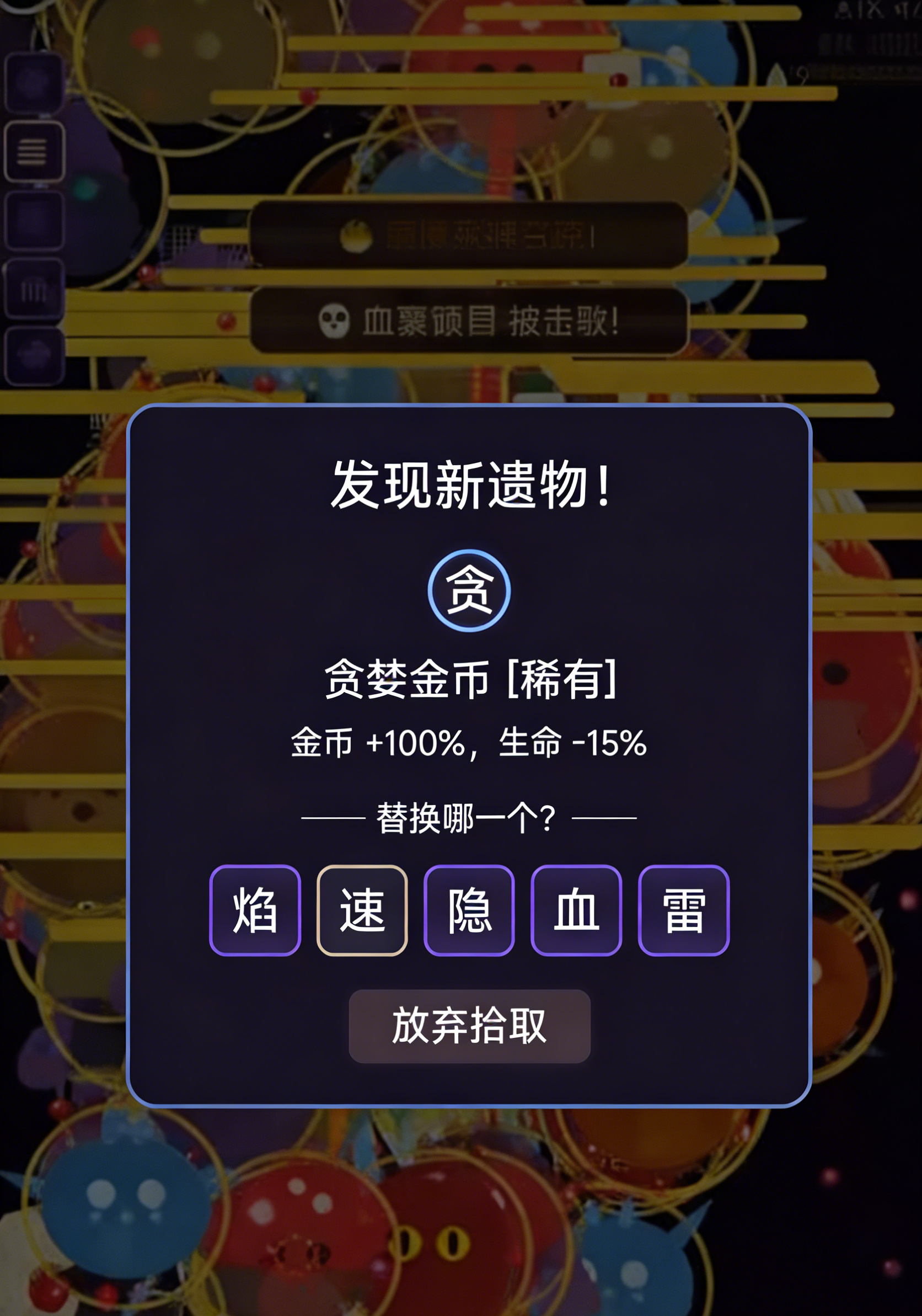 战斗画面强调高密度敌群调度与动态特效反馈,配合流畅连招与范围清屏效果,营造出沉浸式“割草”打击感。关卡内随机生成各类精英怪与固定机制BOSS,考验操作与临场决策。每次击败敌人后有概率掉落特殊遗物,如“贪婪金币”等,拾取后可即时替换当前装备栏位,并激活对应属性加成,形成战局中的关键变量。