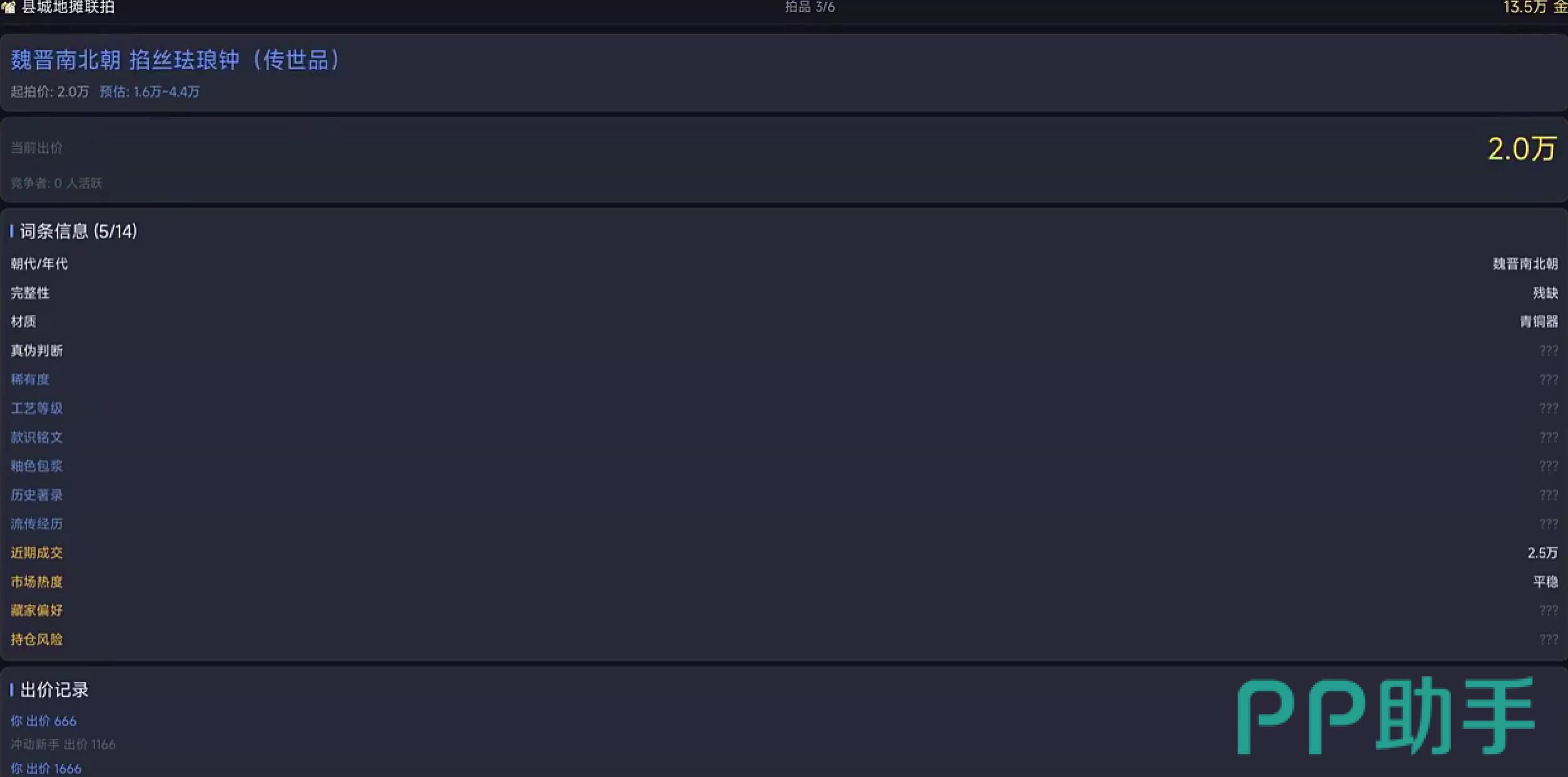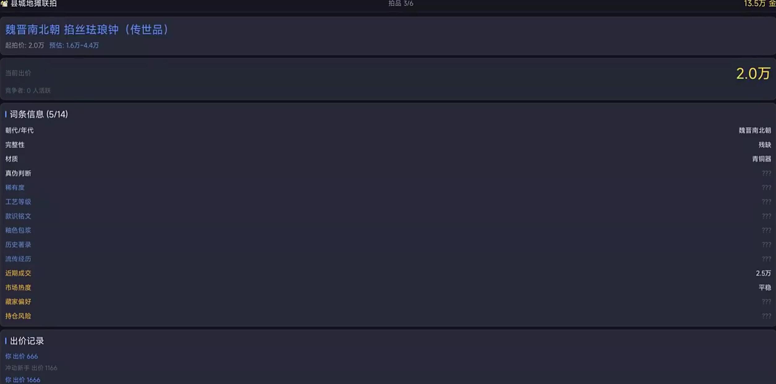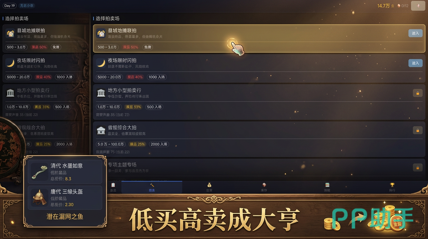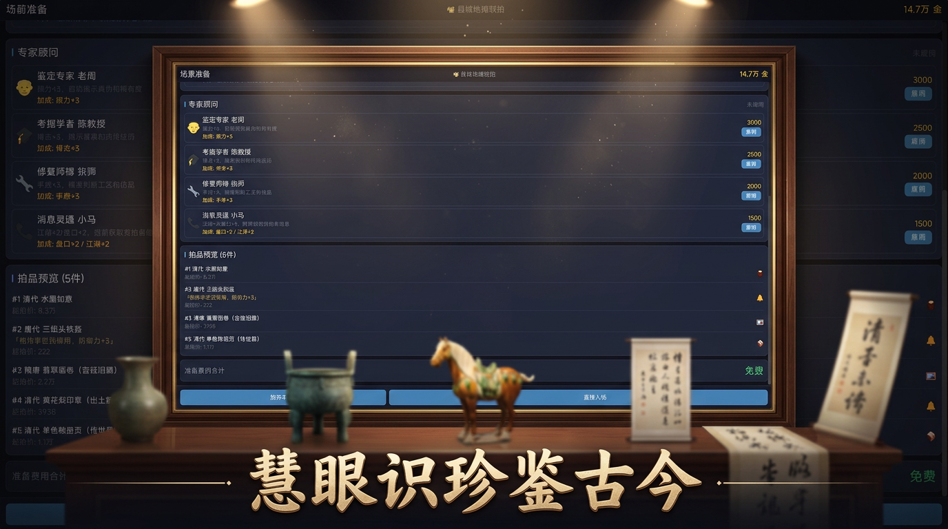 游戏中设有免费开放的基础拍卖场,入场无门槛,拍品价格梯度覆盖百元至万元区间,适合新手熟悉流程、验证基础眼力。但需注意:所有拍场均遵循统一鉴宝规则,即便低价位物品也可能暗藏高仿陷阱,不可仅凭价格判断风险等级,须坚持“先验后拍”原则。