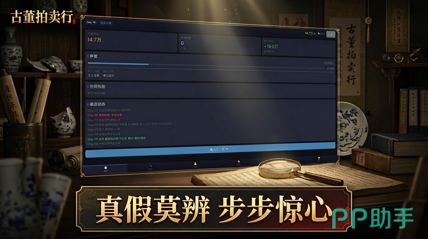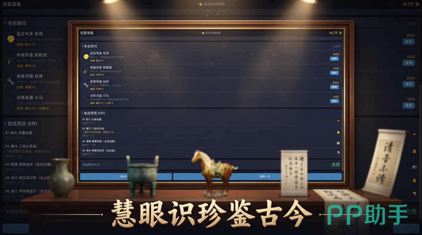 游戏开局为玩家配置初始资金,随即进入首个拍卖现场。全作共设多层级拍卖场所,涵盖新手训练场、限时主题专场及高阶私密竞拍厅等。每场拍卖中,拍品真伪混杂、年代跨度大、品相差异显著,玩家需运用逐步解锁的鉴宝技能——如包浆识别、釉色断代、款识比对等模块化能力,完成真品筛选。随着等级提升,技能树持续扩展,辅助判断维度同步增加。