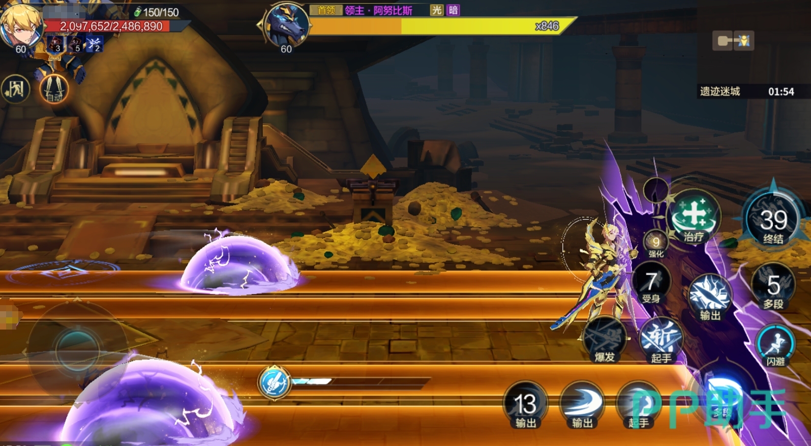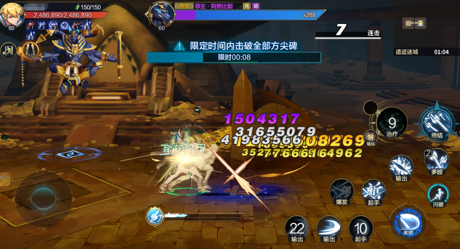 当Boss血量进一步下降至约30%时,将激活第二阶段机制:在场景固定点位生成两座石质尖碑。玩家需在限定时间内连续攻击并摧毁这两座尖碑,方可中断Boss当前状态。在此期间,阿努比斯将持续释放原有技能干扰输出节奏,一旦被控或受击,不仅打断破碑动作,还将承受高额持续伤害。若未能及时清空尖碑,Boss将立即发动终结技,造成全额生命值百分比伤害,几乎必然导致团灭。成功击碎后,Boss再次陷入瘫痪,恢复行动后将不再启用任何机制类技能,仅保留基础攻击逻辑,此时按常规打法即可稳定收尾。