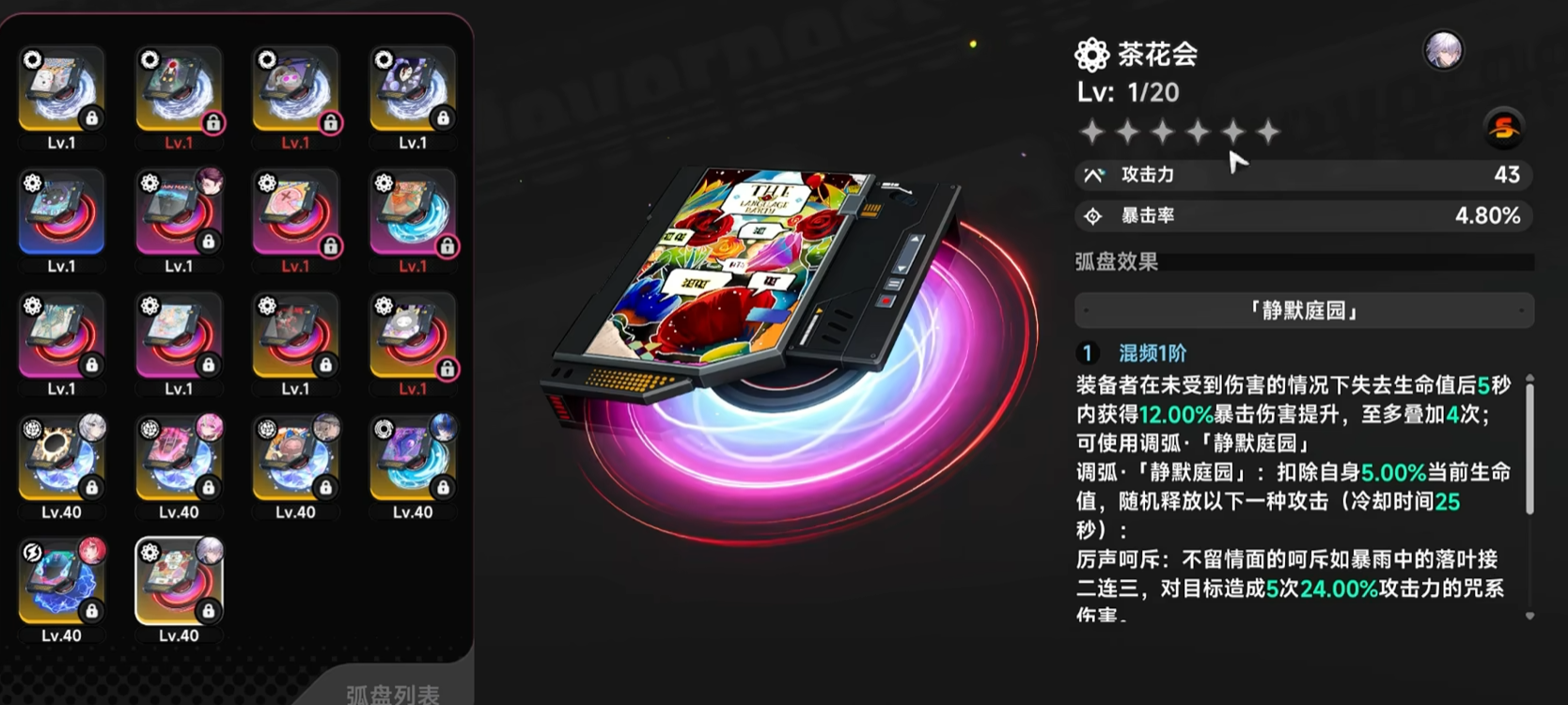 另一热门选择“茶花会”弧盘,则服务于高风险高回报的单体爆发体系。其机制为:角色在未受伤害状态下,每损失1%当前生命值,即可在5秒内获得16%暴击伤害加成,最多叠加4层。该设计高度依赖操作精度——需通过位移规避、技能无敌帧衔接等手法维持“无伤”状态,从而快速叠满层数,在瞬息之间打出指数级伤害跃升,是极限闪避流战士与机动型输出职业的首选方案。