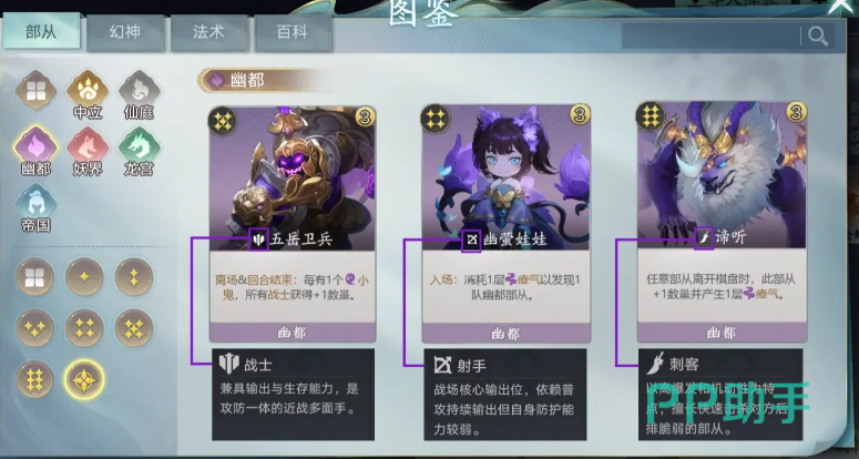 阵营专精型幻神则深度绑定某一势力体系,强调体系内资源联动与机制闭环。以幽都阵营核心辅助钟馗为例,其全部技能效果围绕“瘴气”机制展开:施放技能后可在战场生成瘴气区域,处于其中的幽都单位将获得攻击力与防御力双重加成;当瘴气值累积至阈值,更可激活“忘忧”效果,为全队恢复生命值。若进一步搭配谛听、五岳等同属幽都阵营的单位,可形成瘴气循环与叠加增益,大幅放大体系作战优势。