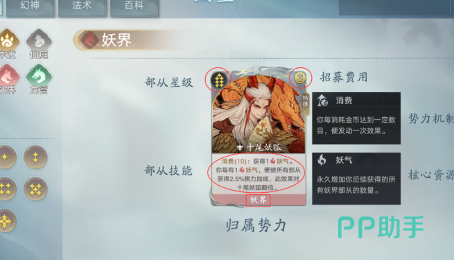 依据实战定位差异,中等幻神可划分为三类:通用过渡型、阵营专精型与功能战术型。其中,通用过渡型幻神不依赖特定阵营即可投入战斗,典型代表为十尾。其核心机制在于技能触发后为全体己方单位提供属性增益,无论用于前期开荒阵容还是中期多体系混搭,均能快速融入并提升团队综合输出与生存能力。值得注意的是,十尾与妖界“妖气”资源存在深度协同——当队伍中配置狐媚、妖狐等具备妖气生成能力的妖族单位时,可显著延长其技能持续时间,从而强化持续作战效能。