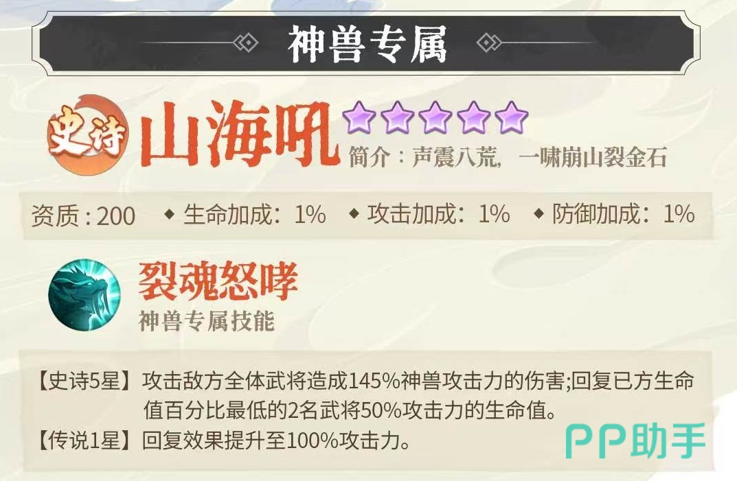 想要获取山海吼,玩家需进入千机阁界面,找到唤兽镜功能,并使用万兽铃进行召唤。每位神兽均为唯一存在,重复获得后将自动转化为对应碎片,可用于升星强化。山海吼属于史诗品质神兽,拥有200资质,同时为全队提供1%生命加成、1%攻击加成以及1%防御加成。其专属技能名为裂魂怒吼,在达到史诗五星时,可对敌方全体武将造成145%攻击力的范围伤害,并为己方血量百分比最低的两名武将恢复相当于50%攻击力的生命值;当升至传说一星后,治疗效果翻倍,提升至100%攻击力。