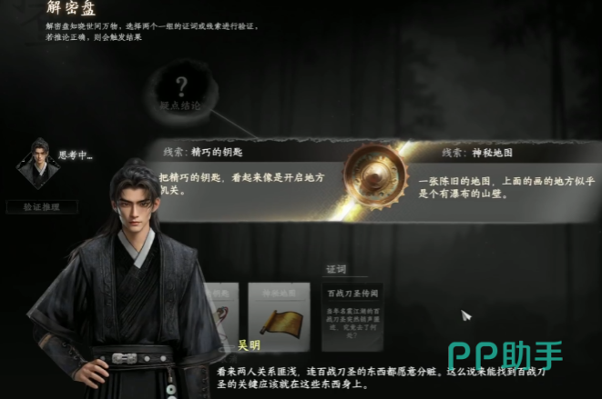 接下来的目标是龙蛇寨宝库,这里藏有另外两项核心道具。玩家需深入龙蛇寨,突破守卫与机关,设法进入宝库内部。在宝库各处细致探查,可寻得精巧的钥匙部件・下以及一张神秘地图。这两件物品对后续解谜至关重要。当玩家集齐百战圣法残卷・上与下、精巧的钥匙部件・上与下,以及神秘地图后,便可进行线索整合。将百战刀圣的传闻与残卷内容对照分析,虽不能直接解锁最终地点,但能揭示吴德与百战圣法之间的潜在关联,丰富背景设定。随后在背包中将两个钥匙部件合成,即可获得完整的精巧的钥匙。