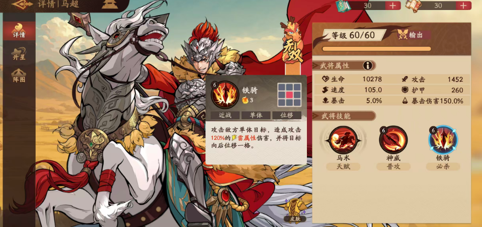 6星满命后,当当前锁定的「劲敌」退场,马超将获得「行动提前50%」的战术优势——此效果每回合仅触发一次,但足以改变关键回合节奏,建议配合控制链或爆发连招使用。此外,其「铁骑」技能可精准打击九宫格中央位置的单体目标,造成120%雷属性伤害,并强制将其向后推移一格。该位移效果不仅具备战术干扰价值,更可主动调整敌方站位:例如将中排敌人推至末排,使我方其他远程角色后续攻击同样享受+5%距离加成,形成协同增伤体系。