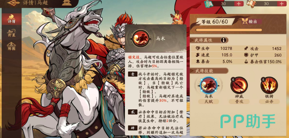 马超的核心输出逻辑围绕「马术」天赋展开——该效果为强制锁定机制,不可被驱散或规避,使其攻击完全不受九宫格站位限制。更关键的是,其伤害随与目标纵向距离呈阶梯式提升:每相隔一排,伤害即提升5%。因此,最优布阵方式是将马超置于我方最末排(第3排),优先瞄准敌方最末排单位发起攻击,此时可叠加最多两层距离增益(即+10%伤害),最大化基础输出效率。