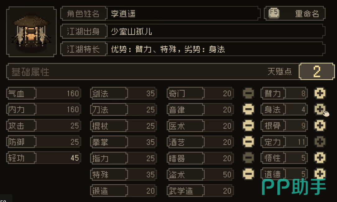 游戏一开始,你会面临选择角色背景和一些初始能力。在这里,强烈推荐选择“少室山孤儿”。因为你可以获得一把不错的武器——前提是你的轻功属性要大于31。建议你在选择数值时,优先提升轻功,这样在开局阶段你就能轻松获得这把武器,并为后续的战斗打下基础。