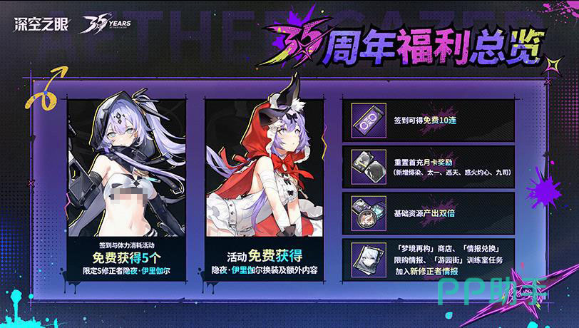 官方在近期的前瞻直播中还公布了三组兑换码:【3.5周年福利庆典】、【吾乃冥王】、【大饱眼福】,每位玩家均可使用,总计可获得900移转之辉。此外,在新版本更新后的指定时间段内完成每日签到任务,即可免费获取S级限定修正者——隐夜伊里伽儿,累计可得5个,相当于直接达成满命状态。
