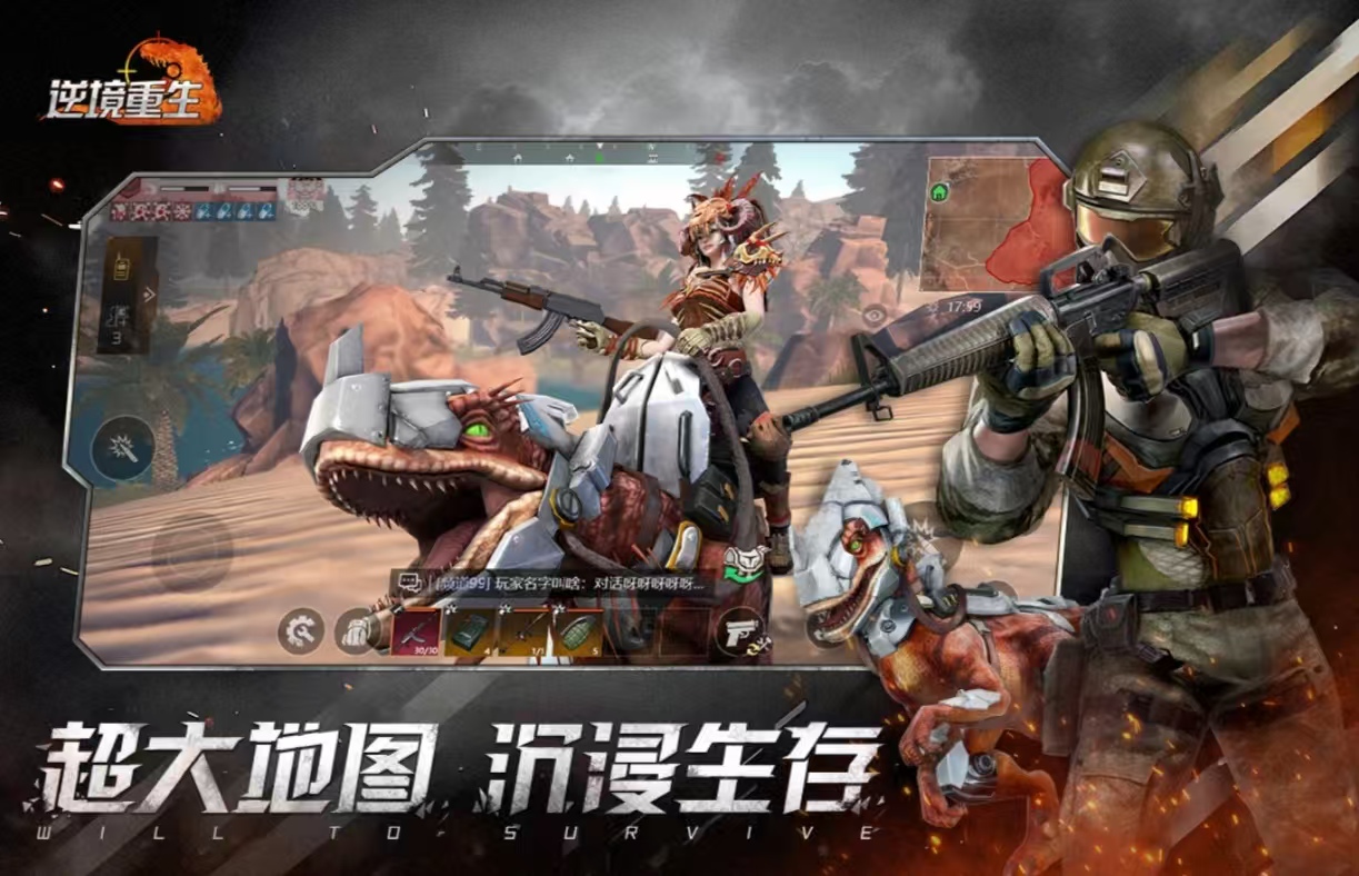 《逆境重开》在一个废土的末日世界,会和其他100位玩家一起进行生存考验,游戏开局使玩家一无所有,想要获得装备和武器需要去寻找。搜索到了所有食材都将收集起来,在游戏的背包中可以查看,可以去选择用木材和石头来建造武器,资源充足后建造一个家园。想要活下来就必须击败游戏中的怪物,可以去捕捉游戏里的恐龙,为恐龙注射安定剂或者进行喂食。