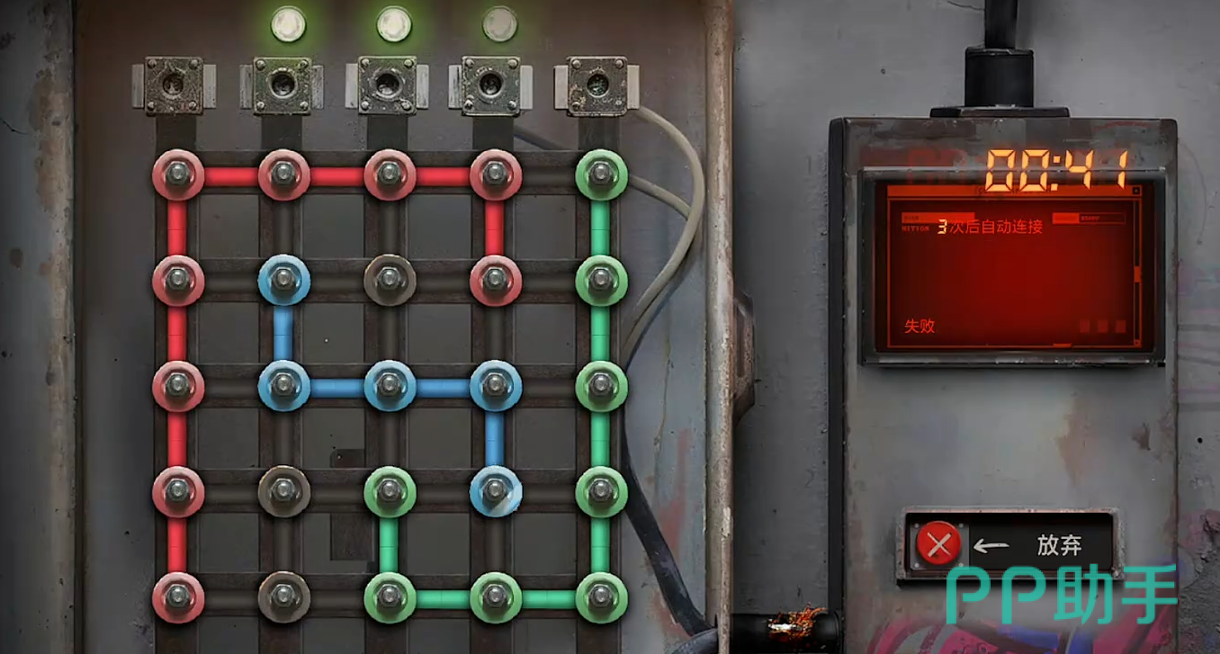 右转后直线行进即可抵达绿卡房。房间中央设有交互式闸点装置,触发后需完成颜色连线解谜:在限定倒计时内,将同色光点以直线连接,全部连通即解锁蓝卡获取权限。该环节无失败惩罚,但超时需重新启动解谜流程。