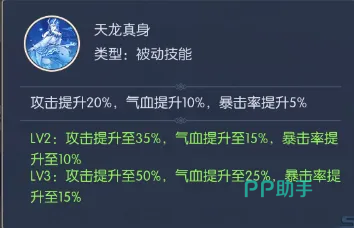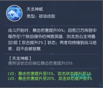 需注意,“天龙降世”的单体伤害上限为施法者攻击值的6倍;此外,该技能有10%概率为目标附加持续2回合的“恐慌”状态,处于该状态的单位命中率降低10%。另一被动“天龙神威”在战斗开始时即激活,使龙吉公主暴击伤害提升10%。