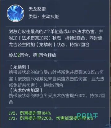 一技能“天雷怒雷”为定向双目标打击技:对敌方攻击力最高的两名单位分别造成153%法术伤害,并施加持续2回合的“法术伤害加深”效果;同时为自身附加“龙鳞刺”状态,持续2回合。该状态可使龙吉公主在受到英雄普通攻击时,减免并反弹30%所受伤害,但该减伤不作用于斩杀类伤害,且仅对来自敌方英雄的攻击生效。