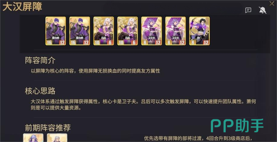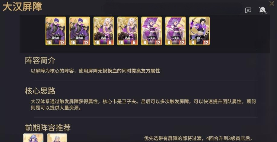 屏障流派强调“无伤换血”与“属性滚雪球”。该体系以卫子夫为核心枢纽,虽获取难度较高,但其余组件如吕后、萧何均属常规卡池产出。吕后可通过多次释放屏障技能,触发被动属性叠加效果;萧何则负责稳定供给金币与经验资源,保障羁绊升级节奏。整套配置在面对高爆发敌人时表现尤为突出,既能规避大量伤害,又可持续强化团队整体战力阈值。