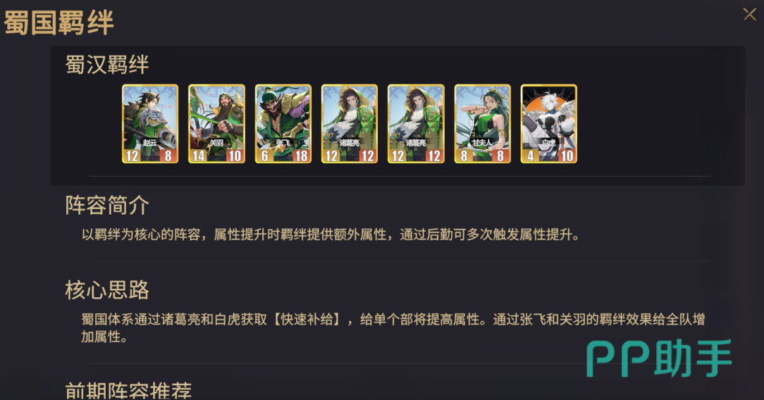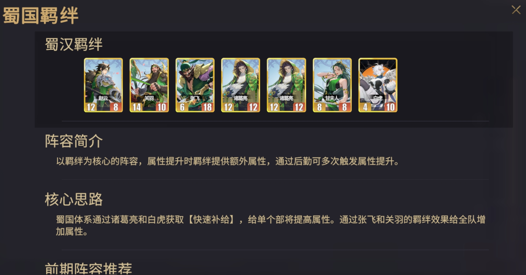 蜀国阵营以高生存+持续输出为定位,其羁绊体系侧重“多段属性叠加”。该流派依赖诸葛亮与白虎协同达成高频补给循环,每轮行动均可为指定武将提供额外生命、攻击或防御增益;张飞与关羽则构成全队增益支点,当二者同时在场时,可为所有友方单位附加固定数值的属性提升。由于蜀系角色基础身板扎实,配合羁绊后具备极强的站场续航能力,尤其适合中后期长线作战场景。