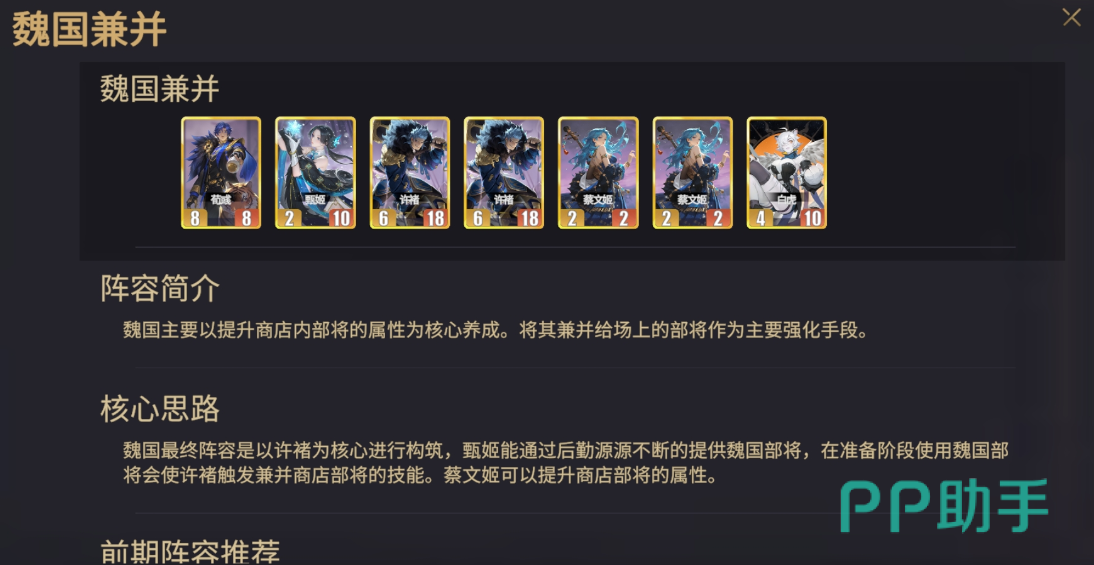 兼并流派主打“动态扩展”机制,通过许褚实现对商店内部将的主动吸纳,并使其技能在当前战斗中生效。蔡文姬在此体系中承担关键辅助职能——她可提升商店中所有待招揽部将的基础属性,从而放大许褚兼并后的实际收益。该流派不依赖固定角色池,而是随战局变化灵活调整战术重心,适合追求策略深度与临场应变的进阶玩家。
