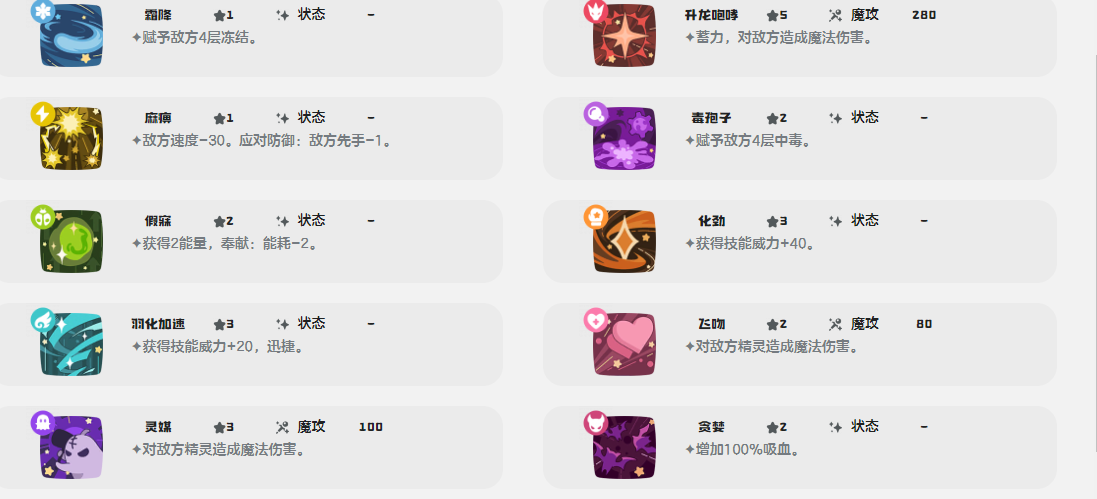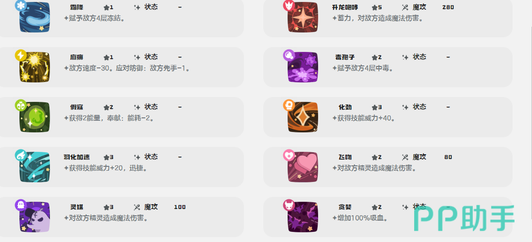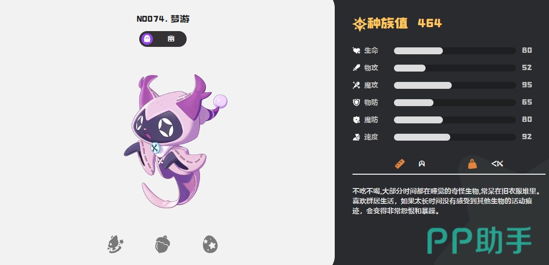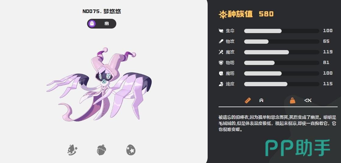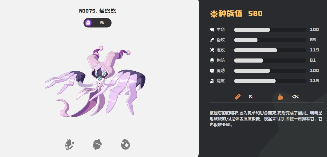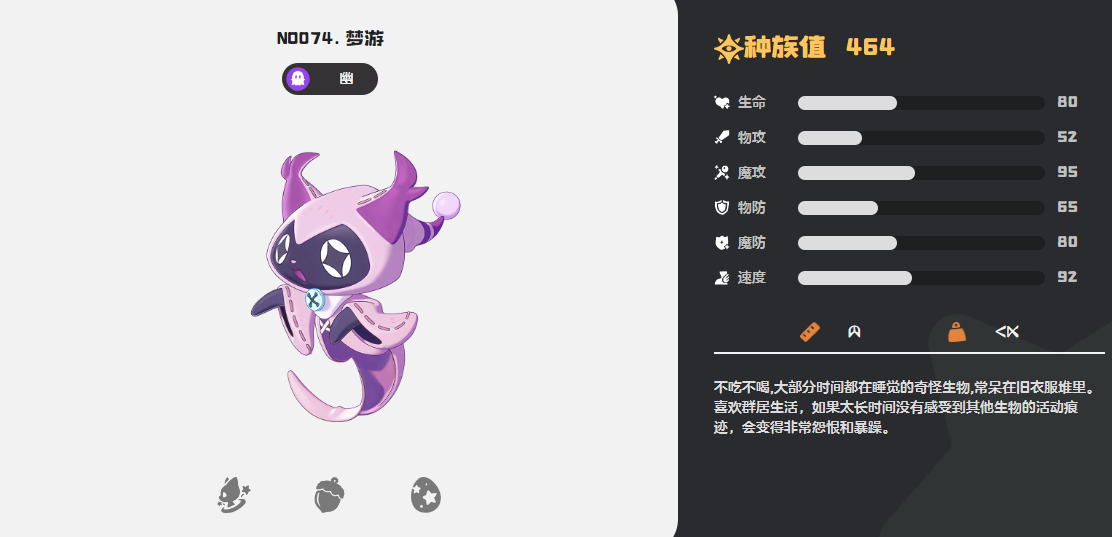 梦悠悠的技能属于消耗型,适合打持久战,它可以利用高生命值和魔攻来压制对手,通过降灵、恶作剧等技能削减敌方能量,再配合幽灵爆发等输出技能,在中后期发挥出强大的战斗力。在阵容搭配上,推荐与控能或减速系精灵一起组队,这样能更好地发挥梦悠悠的优势,不过,要避免让它与地、钢、恶属性的精灵对战,因为梦悠悠的幽属性被这些属性克制,战斗中会处于劣势。