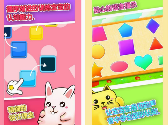 如果小宝宝有很好的认知能力,当然能更聪明,这款学习认知能力的,就涵盖很多的内容,包括利用简单触控设计,体验每种形状,更能在声音中学习各种各样的图形。卡通的小动物,以及丰富的颜色,都能使宝宝爱上这款游戏。还能进行丰富的互动体验,让宝宝的好奇心得到很大的满足。如果你想要让宝宝学习图形的话,这是非常不错的选择。