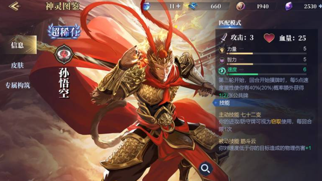 对于玩家来说,获得孙悟空的方式非常的简单。玩家在体验游戏的时候,如果想要获得孙悟空可以借助攒钻石的方式来收集。不过玩家获得孙悟空之后,要注重孙悟空的玩法,比如孙悟空是主速度英雄,攻击力跟多数英雄是一样的,血量中规中矩,不过他的技能却特别的强大,比如孙悟空的主动技能是72变,每回合可将公共牌中的进攻防守牌直接顺手牵羊。