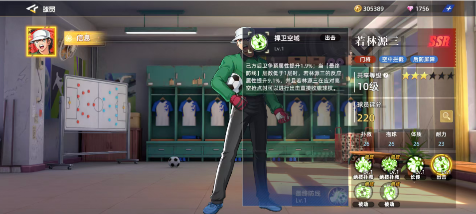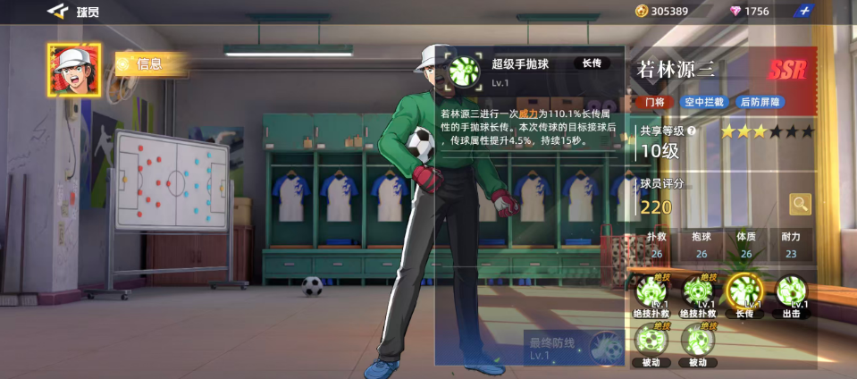 若林源三作为门将位置上的顶级人选,在当前版本中评分高达220,这一数值充分体现了其在实战中的强势地位。他的基础属性全面均衡,抱球、体质和补救三项关键指标均达到26点,耐力也达到了23点,六维属性无一低于20分,展现出极为出色的综合能力。这样的数据配置使他成为目前游戏中最受欢迎的门将之一,尤其在红卡体系中更是稀缺资源。