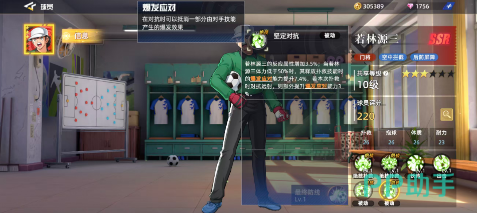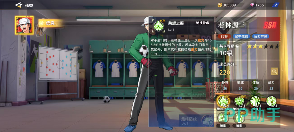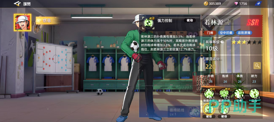 被动技能“强力控制”为若林源三提供了持续作战的支持。该技能为其扑救相关属性增加3.5%,当体力高于50%时,释放扑救技的抱球率提升3.8%;一旦成功抱住来球,还将立即回复12.7%体力,形成良性循环。