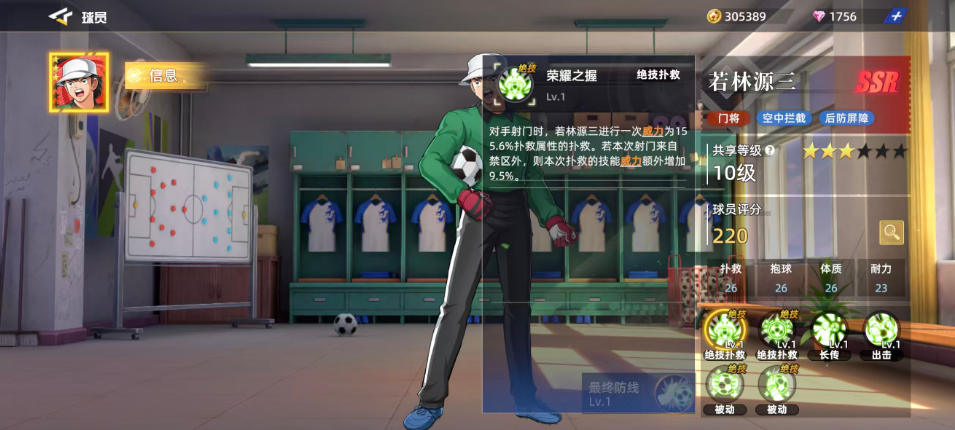 在技能机制方面,若林源三拥有两个核心扑救技:“荣耀之握”与“精准预判”。前者可在对方射门时触发,以115.6%的扑救属性进行拦截;若射门来自禁区外,则技能威力额外提升9.5%,显著增强对远射的防御能力。