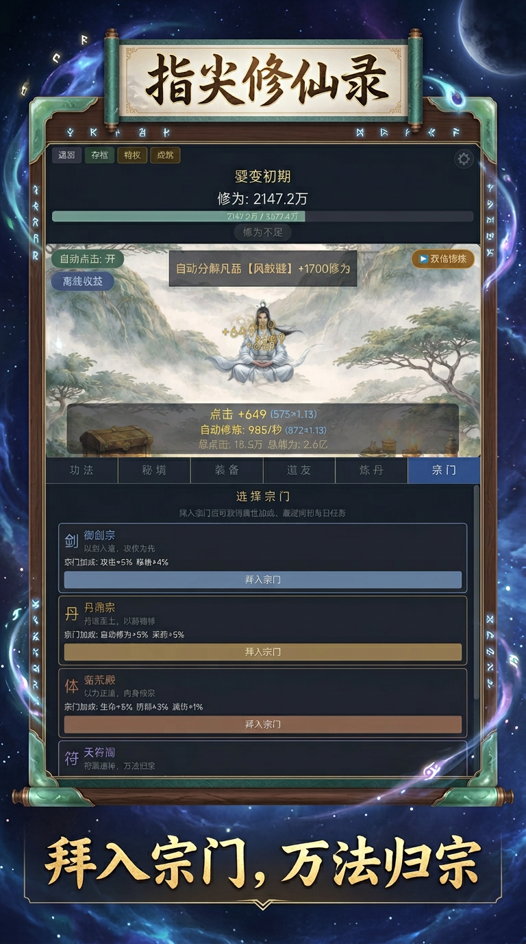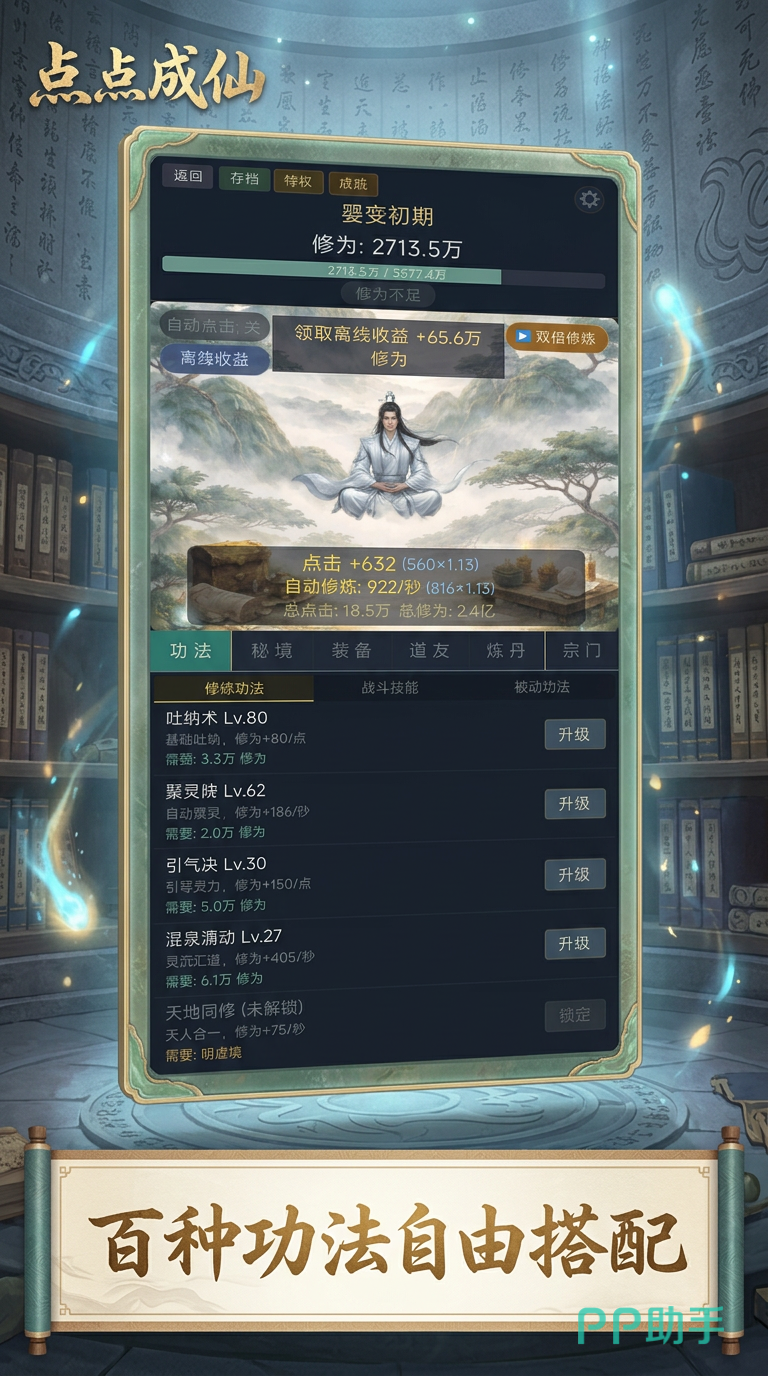综上,《我只是点点怎么成仙了》以“点触驱动成长”为核心设计理念,通过科学的洞府管理、高效的挂机机制与合理的功法配置,让每位玩家都能在低压力状态下稳步进阶,最终达成飞升目标。修仙之路,本不必苦修,一指一点,亦可登临九霄。