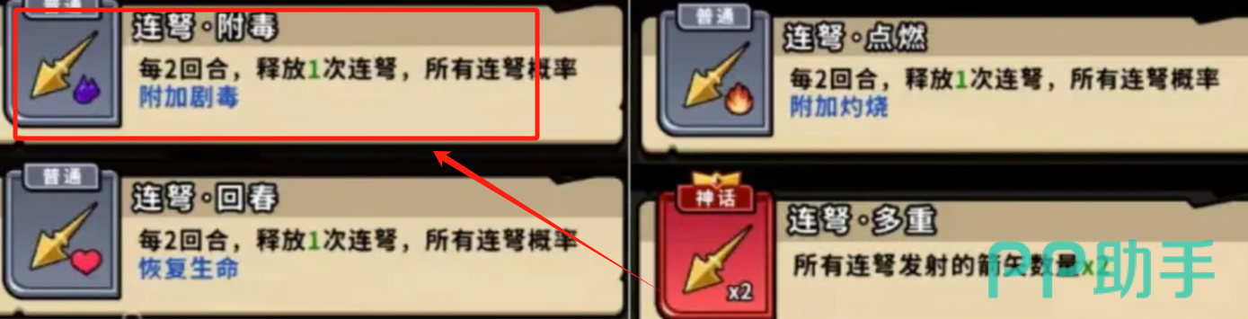 但由于游戏rougelike性质,不代表每一次战斗结束期间,玩家都可以收集出,雷电相关的流派属性,固然下位的选择属性,可以使用火毒消耗流派,其组合逻辑是通过火攻叠加灼伤,并且使用连弩附加毒属性伤害。