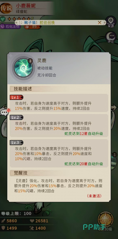 另一被动“灵鹿”赋予动态战斗适配能力:当小鹿薇妮速度高于所攻击目标时,自身伤害提升15%;反之则获得15%速度加成。该效果在20星解锁进阶形态——速度占优时,额外提升20%伤害与10%暴击率;速度劣势时,则提升20%速度与10%闪避率。由此可见,速度属性是小鹿薇妮发挥全部潜力的关键维度,配队时应优先考虑携带速度增益、先手加速或行动条干扰类辅助蛇灵。