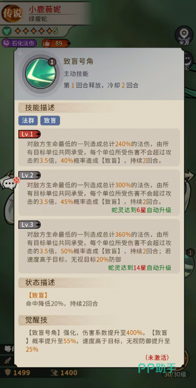 其一技能“致盲号角”为核心功能性技能,属于主动释放的法术群攻技。初始等级下,该技能对敌方生命值最低的一列单位造成总计240%的法术伤害,并有40%概率施加持续2回合的致盲效果(命中率下降20%)。随技能升至3级,总伤害提升至360%,致盲概率同步增至50%。值得注意的是:该伤害由目标列内所有单位共同分摊,但单体承伤上限为小鹿薇妮攻击力的3.5倍;若小鹿薇妮速度高于任一受击目标,则额外触发无视20%防御的效果;觉醒后,技能总伤害达400%,致盲概率升至55%,且速度压制下的无视防御效果强化至25%,为当前版本中同类型控制技能里机制最完整的成长路径之一。