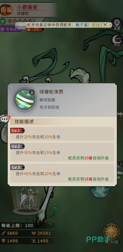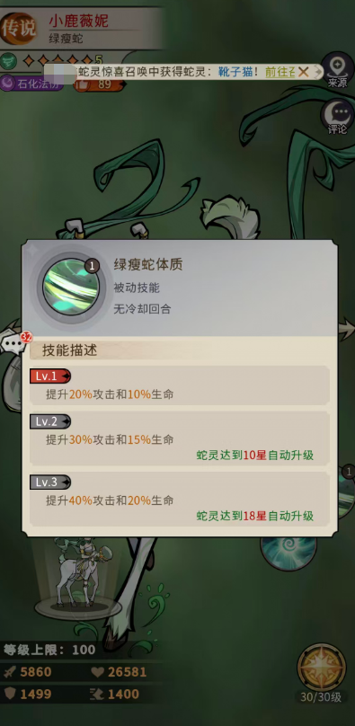 被动天赋“绿瘦蛇体质”提供基础生存与输出支撑:初始生效时提升20%攻击与10%生命;当小鹿薇妮升星至18星时,自动升级为40%攻击加成与20%生命加成,属成长曲线明确、收益递进清晰的常驻增益类被动。