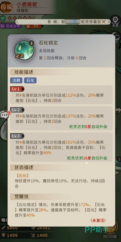 二技能“石化锁定”为必杀技,需手动释放,是小鹿薇妮实现硬控的核心手段。初始效果为随机选取4名敌方单位,各造成112%法术伤害,并有20%概率附加石化状态——被石化单位物抗+10%、魔抗-10%,且完全无法行动。该技能在3级时,石化触发概率提升至40%(需满足速度高于目标);觉醒强化后,单体伤害升至172%,基础石化概率为28%,在速度压制条件下最高可达45%。由于石化会显著削弱敌方魔法抗性,因此推荐搭配高爆发魔攻系蛇灵形成“控→打”连段,物理输出型队友则难以最大化利用该机制。