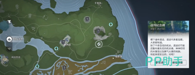 第二处目标为战场纪念碑。登上碑体平台后,找到可操控机关,将其向外旋转两圈,触发机制后拾取第二件道具。