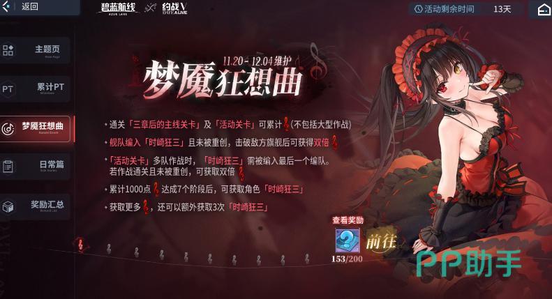 玩家可以在活动“梦魇狂想曲”期间,通过参与战斗逐步解锁时崎狂三。活动时间为11月20日至12月4日。活动开启后,狂三将以NPC身份提前进驻船坞供玩家体验,但此状态仅为试用,并非正式获取。若未完成相应任务,活动结束后该角色将被收回,请务必注意及时参与活动积累进度。