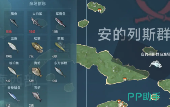 首先在游戏里的就是安德列斯群岛渔场,在这个渔场里能获得很多等级较高的鱼类,比如大白鲨和旗鱼、琥珀鱼,渔场的位置就在皇家港北侧,另外在这里还有11级的军曹鱼和10级的蓝鱼,最低级是3级的石鲈,和4级的香梭鲅鱼,如果想捕获对应的鱼类,那就可以来安德列斯群岛渔场,在百慕大渔场里,鱼类的等级相对来说比较低一些,等级最高的就是11级的军曹鱼和10级的蓝鱼,但是在这里有8级的条纹鲈鱼,这是游戏里的一种特殊鱼类,等级比较低的有1级的沙丁鱼和5级的马鲛鱼。
