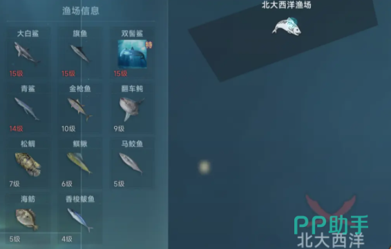 在北大西洋渔场里,鱼类的等级大部分都比较高,并且也有一种特殊鱼类,首先就是等级最高的15级大白鲨,还有15级的旗鱼,另外还有15级的双髻鱼,这是一种特殊鱼类,另外还有14级的青鲨和10级的金枪鱼,等级比较低的有4级的香梭霸鱼和5级的海鲂鱼,另外一个渔场就是北海渔场,这个渔场位于不列颠岛东岸,渔场里有10级的大虾,6级的绿旗鱼,另外就是1级的沙丁鱼和飞鱼,还有2级的秋刀鱼这些低等级鱼类。