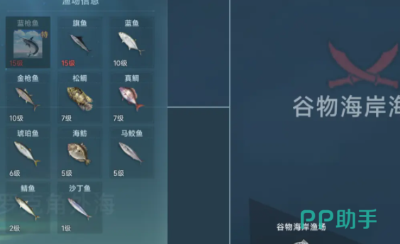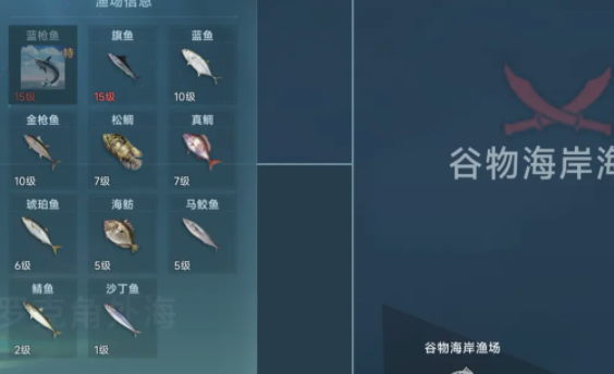 在谷物海岸渔场有15级的蓝枪鱼,这是一种特级鱼类,另外还有15级的旗鱼,10级的蓝鱼,金枪鱼,以及等级比较低的沙丁鱼和马鲛鱼,好望角海域有15级的大白鲨和14级的青鲨,这里的鱼类体型相对来说比较庞大,在黑海渔场的鱼类等级都比较低,最高级的就是鲟鱼,剩下的就是沙丁鱼和鳗鱼。