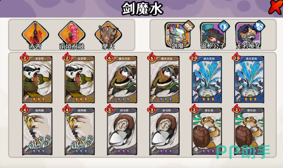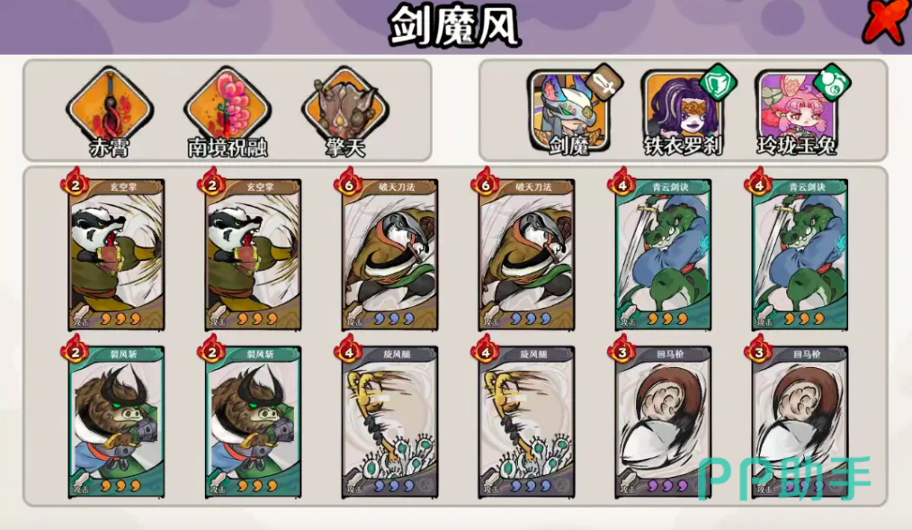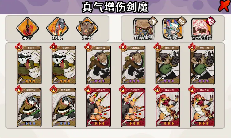 【真气增伤流】——高资源投入型爆发体系 神兵优先级:擎天(满阶最优)、赤霄、赤痕(三者构成真气叠加闭环)。 侠客调整:保留剑魔与金狮,将玉兔替换为云林圣僧(需满足2命条件),以强化真气转化效率与持续增益覆盖率。 卡组结构:沿用剑魔专属8张基础卡组,额外加入4张以灼烧效果为核心的攻击型卡牌,形成“真气叠层→灼烧触发→持续压血”三位一体输出链。