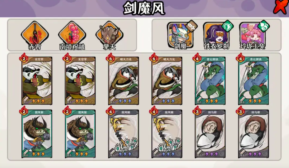 【土系通用流】——兼顾生存与输出的入门首选 神兵配置:擎天(必带)、赤霄(次选)、南境祝融(优选);若暂缺祝融,可替换为绝情;若二者皆无,则选用回怒作为过渡替代。 侠客搭配:剑魔(主C)+ 土属性金狮(豪侠位)+ 木属性玄狐玉兔(辅助位)。该组合在属性克制与技能联动上具备天然优势。 卡组推荐:幻境四商店限定卡「烈风斩」为核心输出卡,若未获取,可用「独行刀法」替代,维持基础连击节奏与伤害密度。