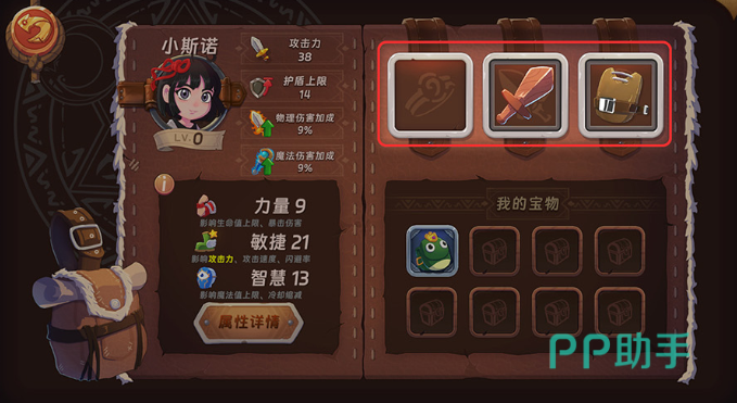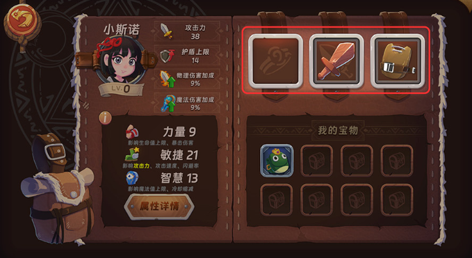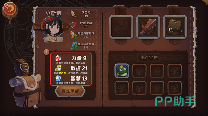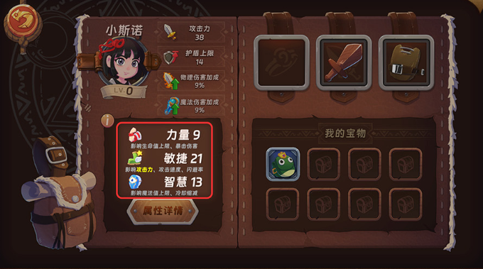 进入旅馆大厅后,玩家可直观看到三大核心养成模块:武器、法术与宝物。所有角色的基础战力均围绕敏捷、力量、智慧三项基础属性展开,但每名角色仅能选定其中一项作为主属性——该属性将获得最高比例的攻击力加成,并直接决定其核心输出逻辑。以小斯诺为例,若将其主属性设定为敏捷,不仅可提升攻击速度与闪避率,还能同步增强整体攻击效果,使其更适配高频连击或生存向打法。