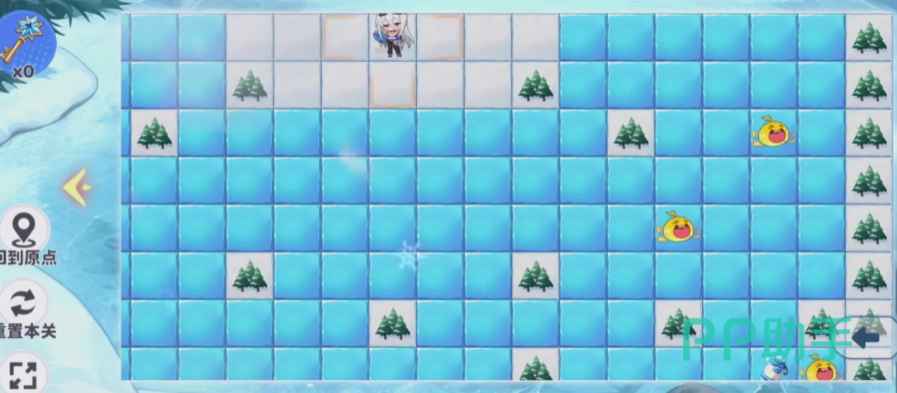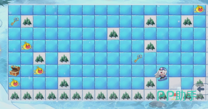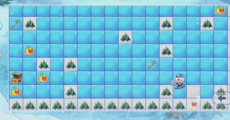 进入第五关后,起始位置位于地图右上方。第一步操作:向左连续滑行,直至抵达最左侧一列冰块的底端(紧邻树木边缘),随后垂直向下移动,同样停靠在靠近树干的冰块上。接着横向右移,依次经过三个冰块,在第四个冰块处暂停。此时正前方出现史莱姆,需向右绕行避开。绕过之后,立即向上滑动两格,到达第三行第五列——此处冰块上放置着一把钥匙,拾取后保持当前横排向右滑行,直至遇到下一个史莱姆所在位置,再次向右绕开,并从该点垂直向下移动一格。