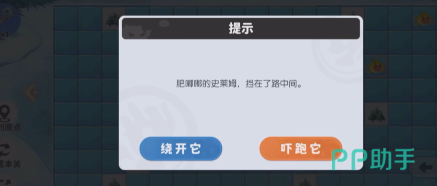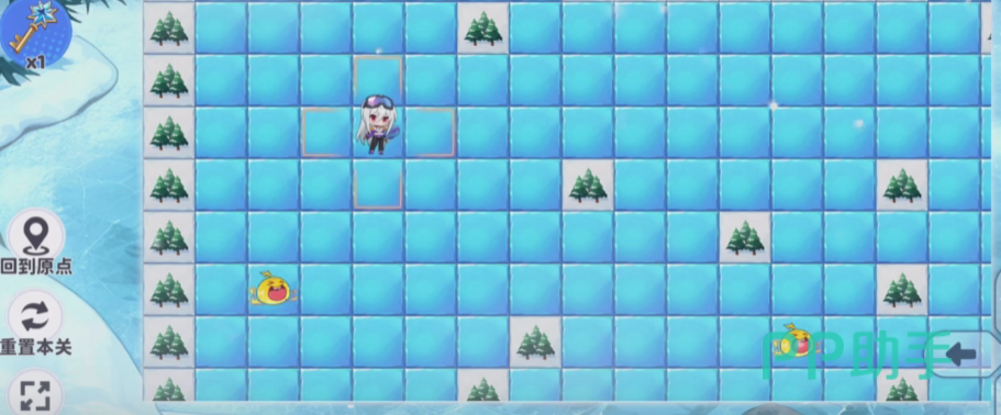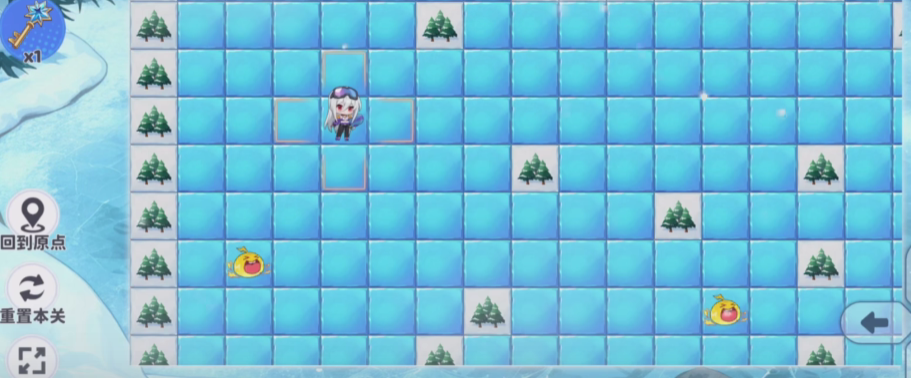 继续向下推进过程中,还将遭遇至少一次史莱姆阻挡。处理方式一致:维持当前行数不变,仅向右平移一格以实现绕行。此操作后将抵达一个未标注名称的神秘宝箱。使用此前已获得的钥匙开启宝箱,完成交互后切勿继续向前滑行。此时应立即转向下方,沿冰面持续下滑,直至抵达靠近树木底部的位置。此时右侧会出现一块无冰面的空地区域,进入该区域后,其正下方可见一面小旗标识——点击该旗帜即可完成关卡判定,成功通关。