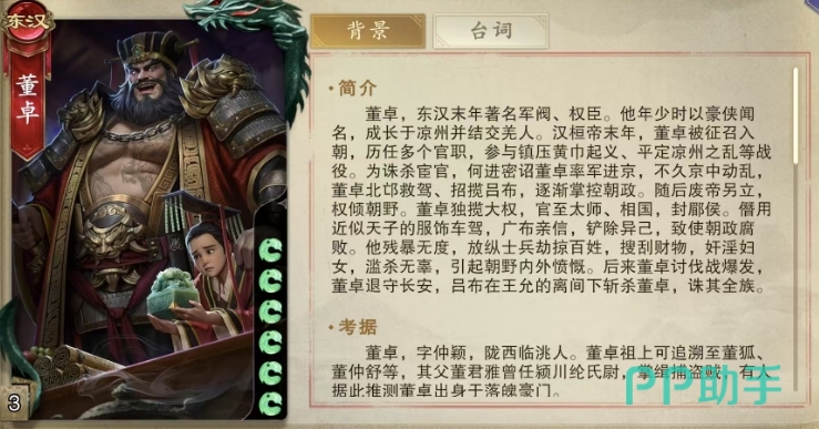 董卓作为东汉末年声名狼藉却又极具权势的军阀与权臣,在历史的长河中留下了浓墨重彩的一笔,而在策略卡牌游戏代号杀的世界里,董卓这张卡牌同样引人注目,代号杀董卓卡牌强不强要看整体的技能设置,这张卡配备了两个独特且强大的技能,让玩家们在游戏中体验到这位历史人物的独特魅力。