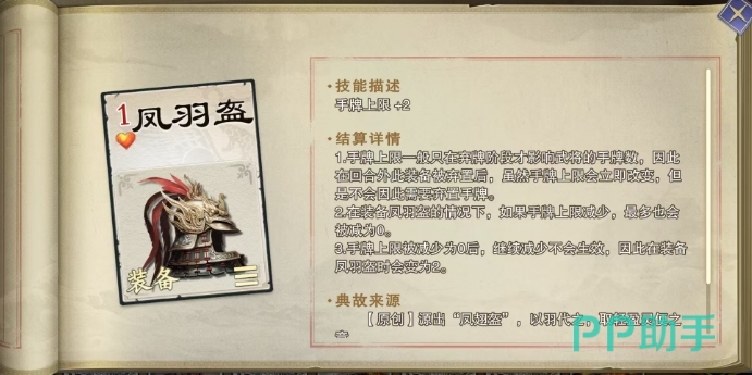 当目标角色因欺天废主技能导致手牌上限降至0时,虽然无法再进一步降低,但这一状态仍然会对角色的手牌管理产生深远影响,例如如果目标角色后续获得了能够提升手牌上限+1的效果,其手牌上限并不会直接恢复到1,而是会变为1,此外游戏中还存在一件名为风羽盔的装备,它能够提升佩戴者2点手牌上限,即使是这件看似能提供保护的装备,也无法完全抵御欺天废主技能的影响,一旦佩戴风羽盔的角色被董卓选中并成功发动技能,其手牌上限将被减少至0,即使该角色后续再次装备上风羽盔,其手牌上限也不会恢复到原始的2点,而是会固定为2点。