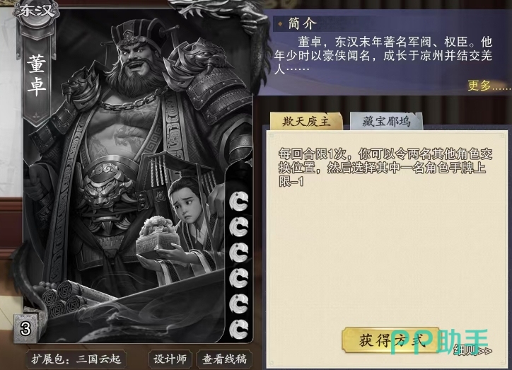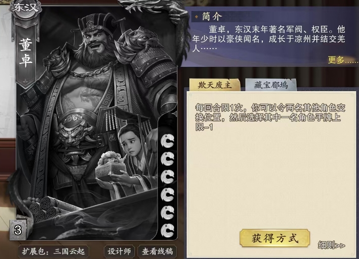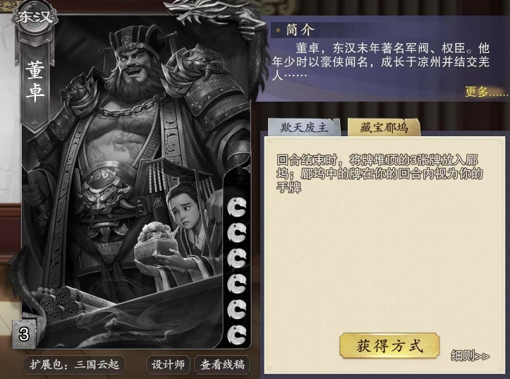 除了这张武将卡跟装备卡的搭配效果要注意之外,他还有第二个技能叫做藏宝郿坞,这个技能是每当回合结束,便会触发这一神秘机制,此时大家可以从牌堆顶端精心挑选的3张牌,转移至一个特别的场外区域,这个区域叫做郿坞,宛如董卓的私人宝库,既隐秘又安全,存放于此的牌在董卓的回合内,能够如同手牌一般灵活运用,无论是果断打出以应对危机,还是适时弃置都可以做到。