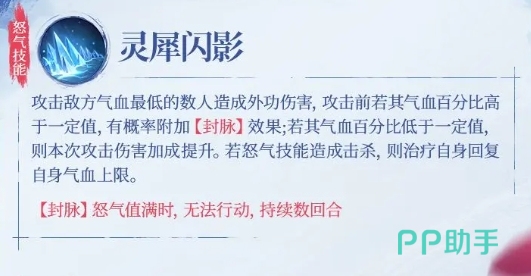 而当目标的气血百分比低于一定值时,本次攻击的伤害加成还会得到提升,这使得姬如雪在面对不同血量状态的敌人时,都能有出色的输出表现,其二若怒气技能在战斗中造成了击杀,那么姬如雪还能够治疗自身,回复自身气血上限,其三封脉效果的具体表现为,当怒气值满时,敌人无法行动,且这种限制会持续数回合。