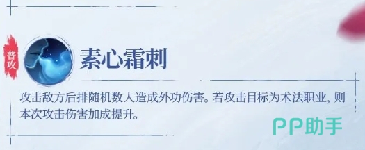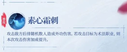 再来看姬如雪的普攻技能叫做素心霜剌,在攻击时,能够对敌方后排随机数人造成外功伤害,这一设计使得她在攻击位置上有了更多的选择,一般就算是针对后排输出也可以利用这个技能,且对于术法攻击也是有克制效果的,这让她在面对术法职业时,能够更有效地发挥出自己的输出能力,对敌方的法术输出体系形成一定的克制。
