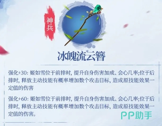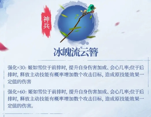 说到姬如雪的神兵,那就是冰魄流云簪,当冰魄流云簪强化到+30时,会给姬如雪带来不同的属性加成,若她位于前排,能够提升自身伤害加成以及会心几率,让她在前排承受伤害的同时,也能有更强的输出能力,而当她对后排输出的时候,输出的时候可以从单个目标变成多个目标输出,这进一步增强了她在后排的输出范围和伤害量,当强化到+60时,效果与+30时类似,所以提升了她在不同位置下的战斗能力。