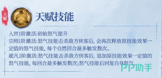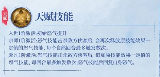 除了技能方面,姬如雪的天赋技能也为她的战斗能力增添了不少助力,当玩家达到入世1阶时,激活的天赋是初始怒气提升,这一天赋让她在战斗开始时就能更快地积攒怒气,从而更早地释放出强大的怒气技能,当达到宗师1阶时,这个天赋是大家使用上面的怒气技能成功将对面目标给击退的时候触发的,此时就会会再次释放技能,且也是怒气技能的效果,每个自然回合可以触发数次。